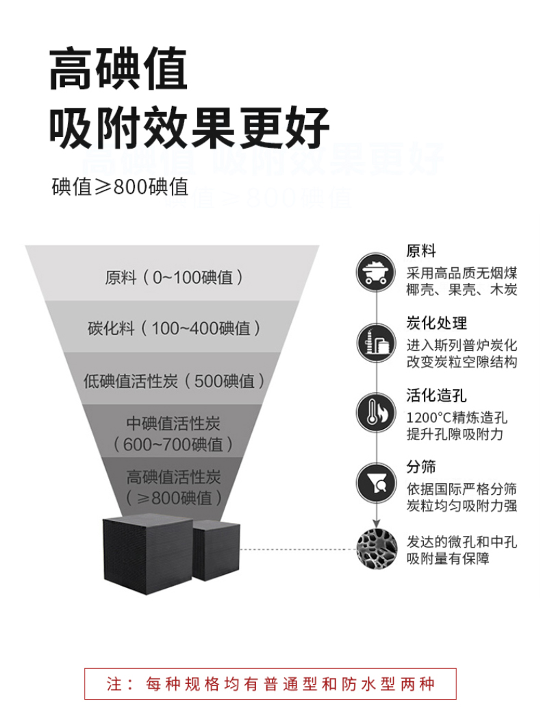 3、活化劑種類的影響:蜂窩活性炭有多種添加劑,粘合劑、吸附助劑、活化劑和耐水材料等,即便在同問下,不同種類和數量的活化劑反應速度就不同,反應溫度和反應時間會有差別,很難確定具體時間,由此燒制的蜂窩活性炭碘值就有區別。