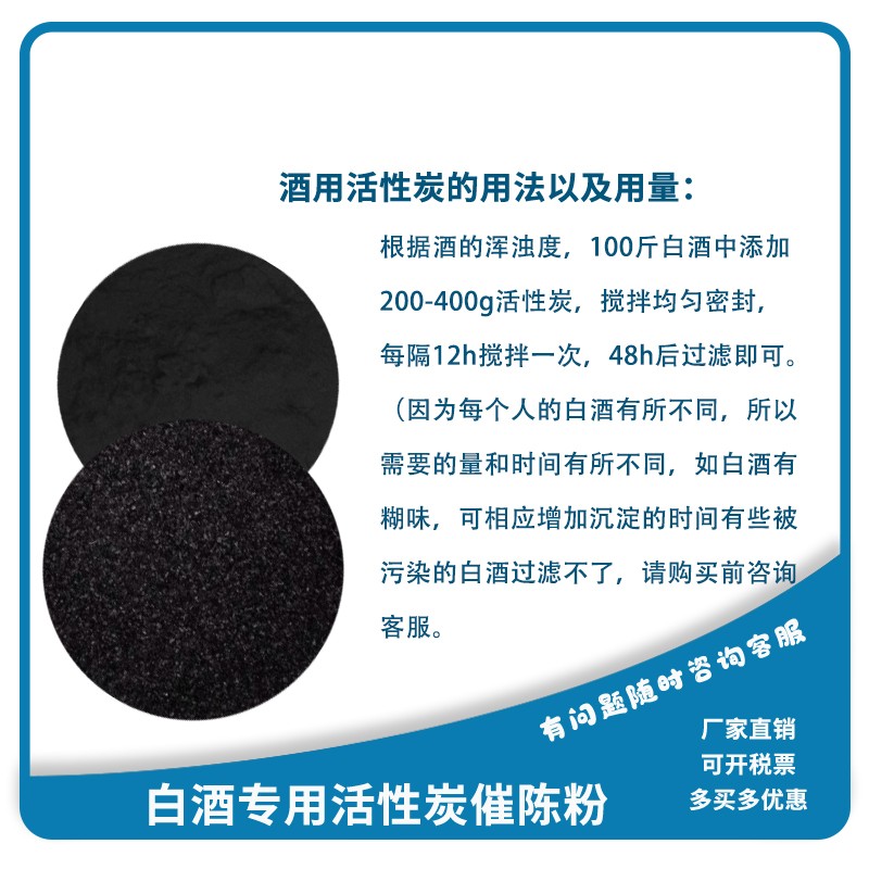選用優(yōu)質(zhì)木屑、果殼、椰殼等原料精制而成的酒用粉狀活性炭,主要作用于低度酒除濁、催熟、陳化。去除酒精及高度酒中的異雜味,防止高含酯量低度白酒低溫下渾濁。