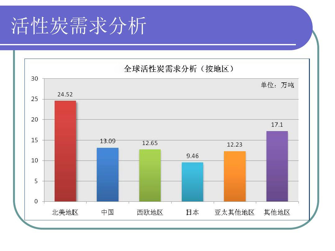 從活性炭需求的地區分布來看,中國、美國、歐盟和日本是活性炭的主要消費區域,中國是僅次于美國的全球第二大活性炭消費國。近年來,隨著發展中國家宏觀經濟不斷發展,工業增長帶來環境污染問題日益突出,因此各國對環境治理、環境保護的力度不斷加強,從而帶動該地區活性炭消費的快速增長。